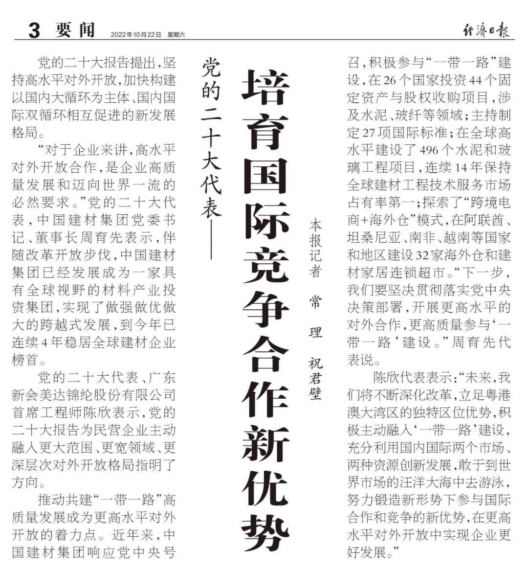 10月22日,中國(guó)共產(chǎn)黨第二十次全國(guó)代表大會(huì)勝利閉幕。中國(guó)建材集團(tuán)周育先、趙小梅兩位代表以高度的政治責(zé)任感和歷史使命感,履行了黨代表的莊嚴(yán)職責(zé)。日前,繼人民日?qǐng)?bào)、經(jīng)濟(jì)日?qǐng)?bào)、中新社、中國(guó)企業(yè)家(點(diǎn)擊藍(lán)色字體可查看)對(duì)他們采訪(fǎng)報(bào)道后,又有多家媒體進(jìn)行了采訪(fǎng),小料帶您去看看~