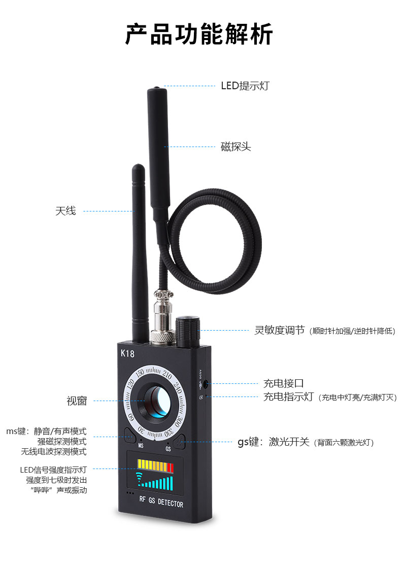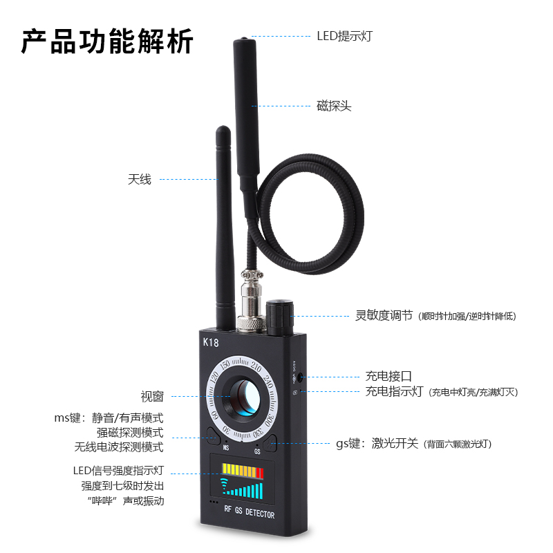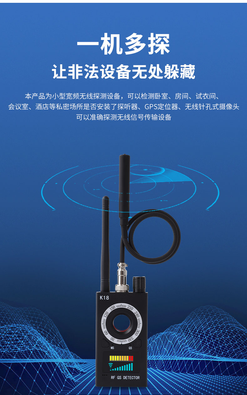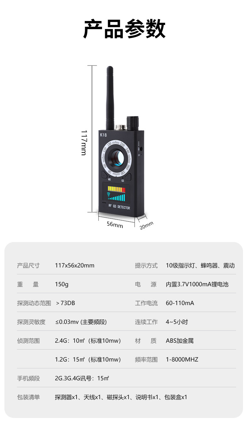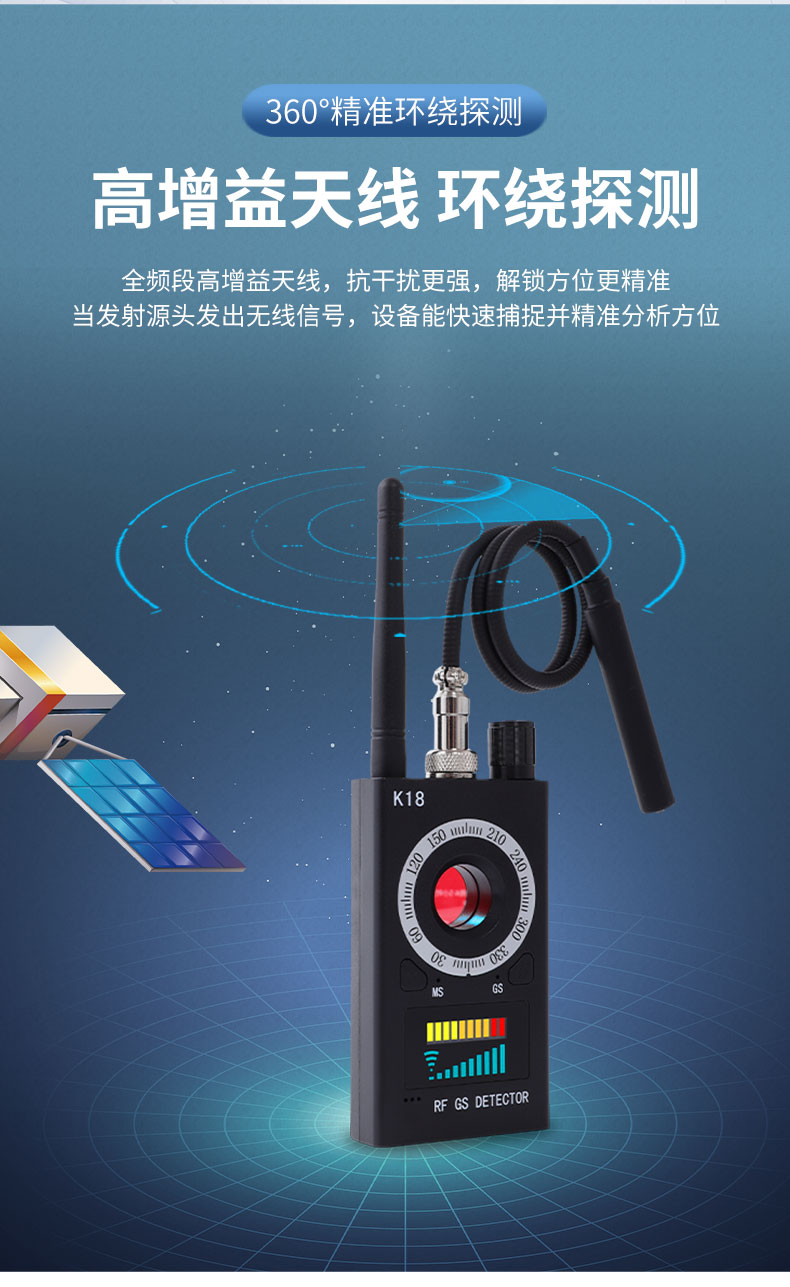 科密攝像頭探測(cè)器酒店防鏡頭偷拍反監(jiān)控竊聽(tīng)汽車北斗gps探測(cè)K18