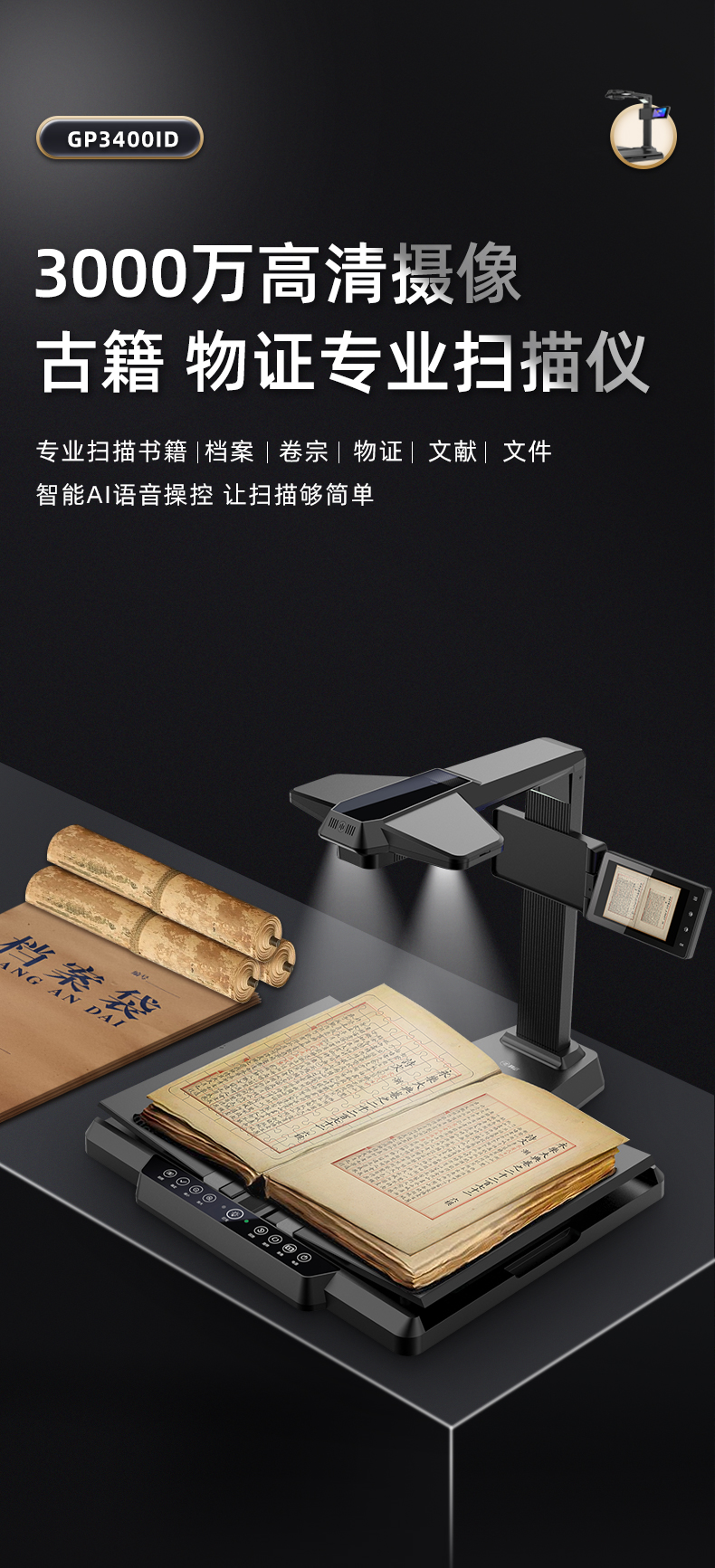 科密 GP3400ID 3000萬(wàn)高清像素高拍儀 書籍成冊(cè)掃描曲面展平 A3A4古籍物證檔案掃描儀